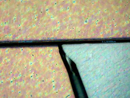 ●金相顯微鏡看手機(jī)玻璃蓋板背膠刀印測(cè)試