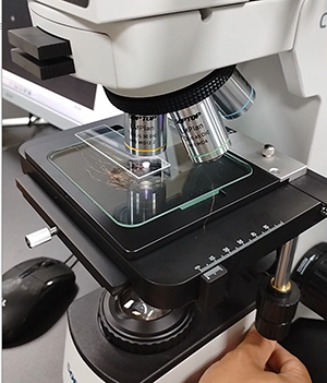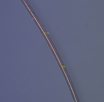 ●銅絲測量,由于銅絲比頭發(fā)絲還細軟,因此觀察前需要用玻璃片壓住,然后再測量其直徑。