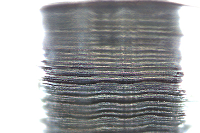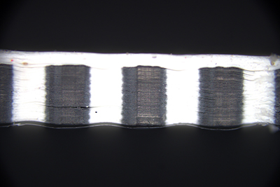 這是陶瓷電容在疊層后的檢測(cè),由圖可知,陶瓷電容是由多層電容疊加而成,用顯微鏡檢測(cè),主要是觀察其疊加有沒(méi)有移位,疊加是否平整等,如需測(cè)量也可以用金相顯微鏡測(cè)量,操作還是非常方便的。