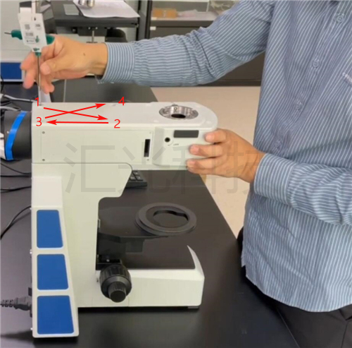 1、金相顯微鏡安裝光路。先將光路上面的4顆螺絲上的防塵蓋取下,然后分別對角安裝螺絲并鎖緊,再蓋上防塵蓋。