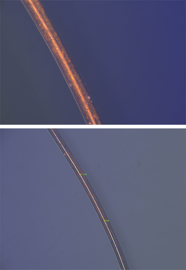 有圖可知,我們拍攝的金屬銅線直徑為50微米左右,而普通人頭發(fā)絲粗細(xì)在100微米左右,因此,您想要更好觀察銅絲,還是備一臺(tái)專用金相顯微鏡吧。